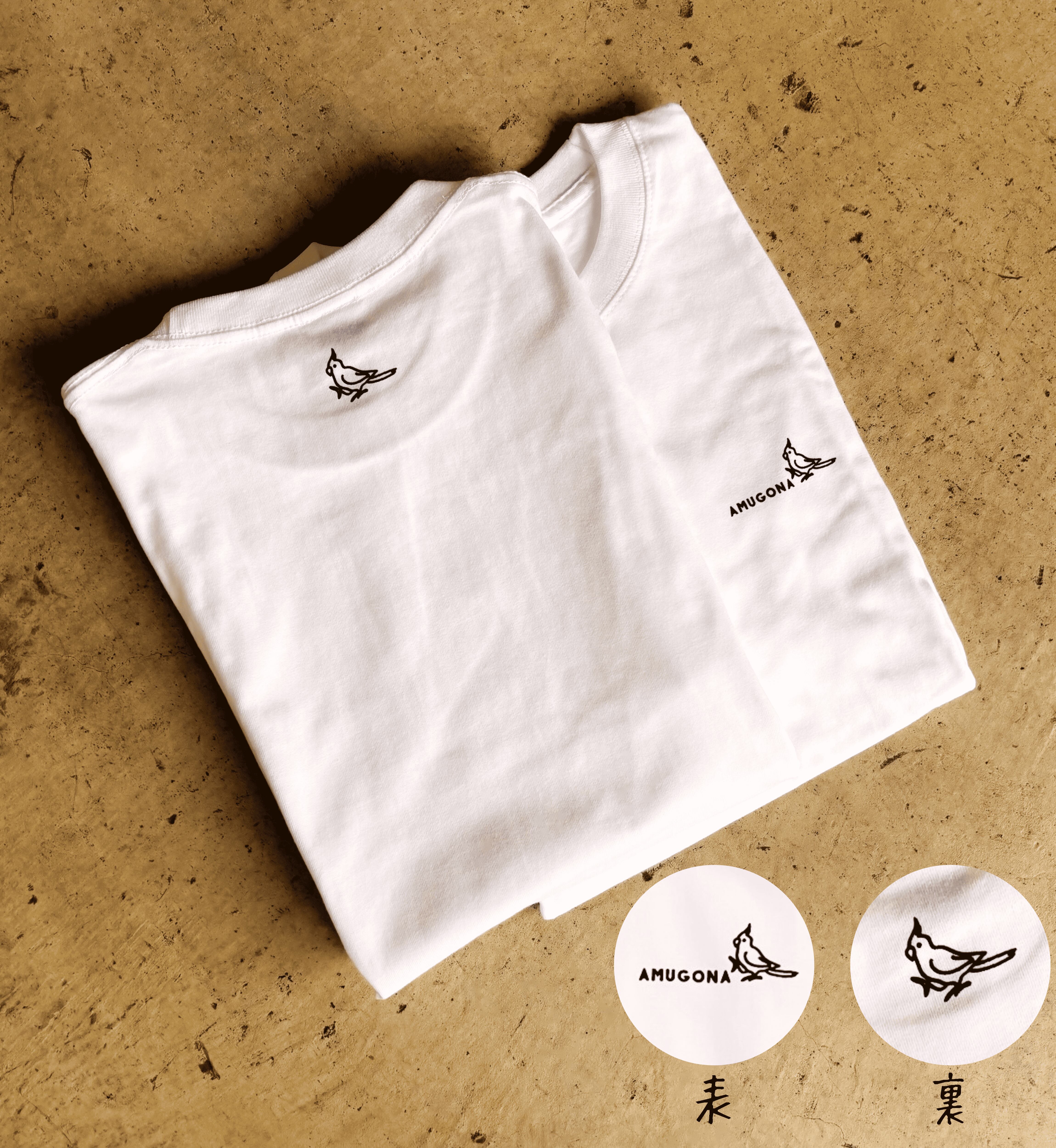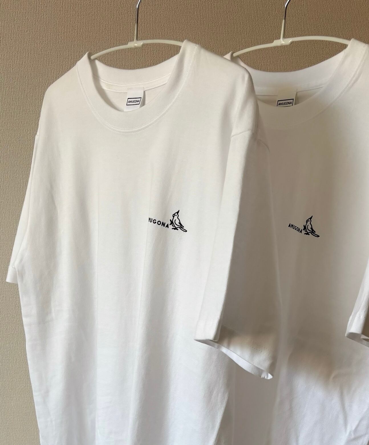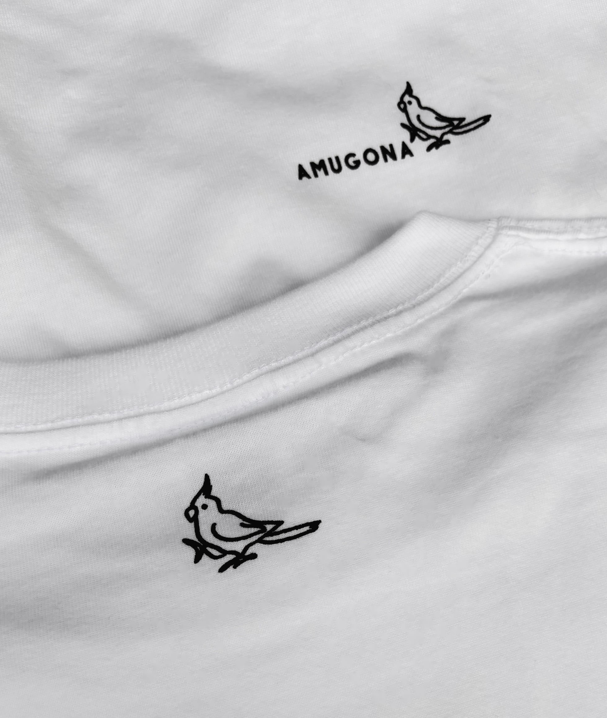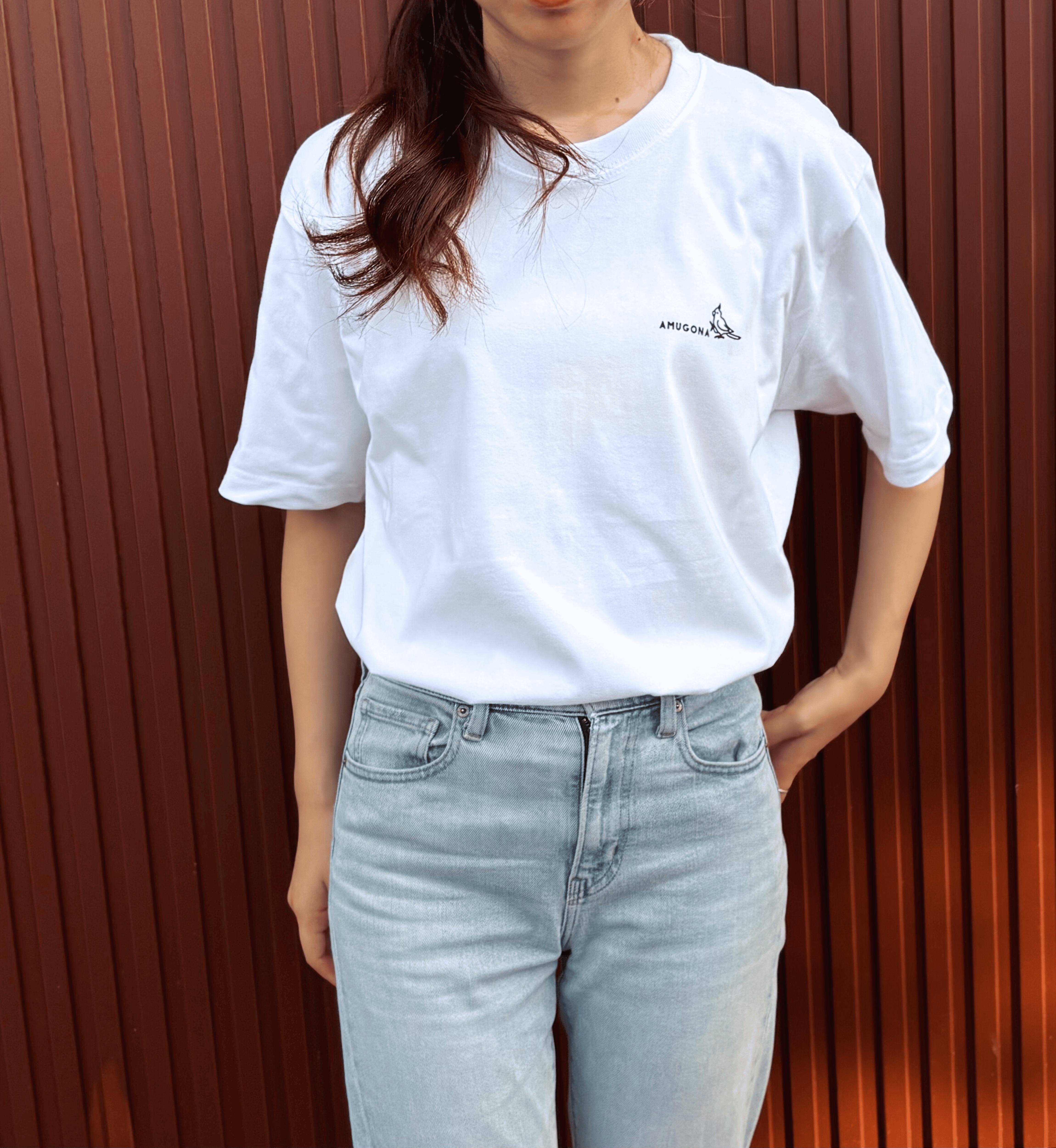 胸元には「AMUGONA」のロゴをさりげなく配置。